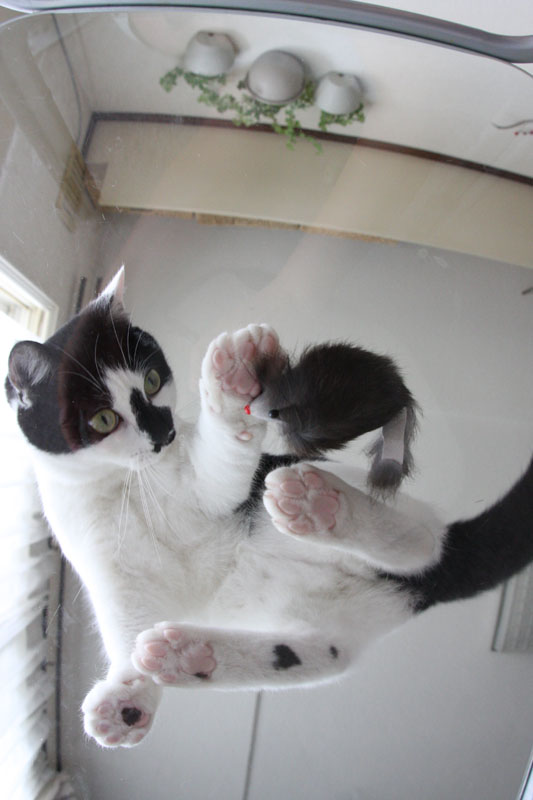 ガラステーブルの下から見上げるように撮影した。真下から撮影することで、かわいらしい肉球や普段見せない表情、姿を写すことができる。