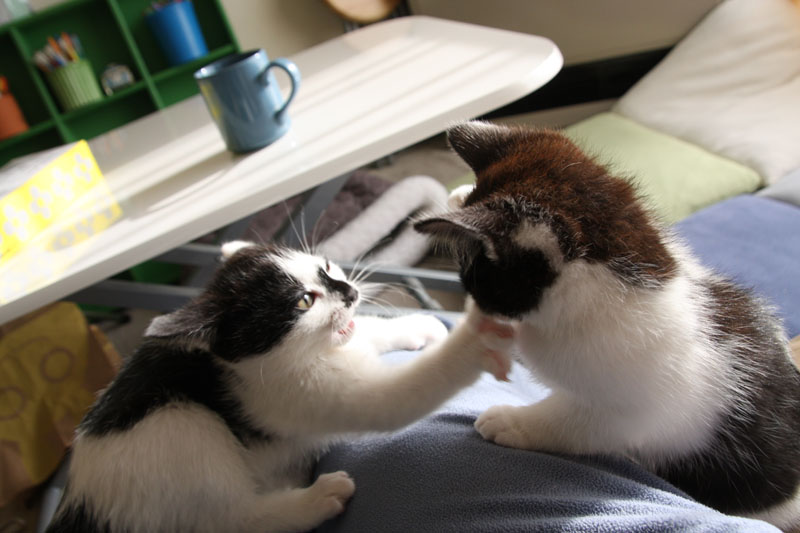 じゃれ合う子猫を撮影するときは、動きの速いものをなるべくぶらさずに撮影してくれるスポーツモードを利用するとよい。