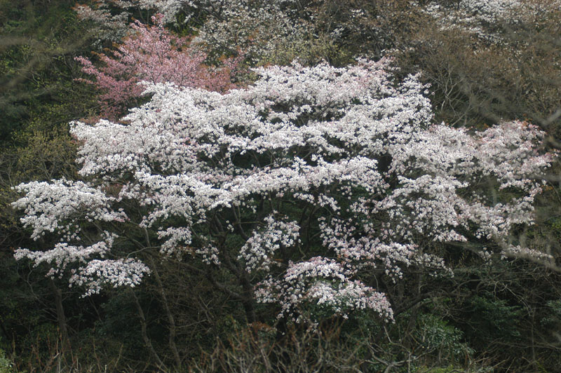 形のよい桜の木はなかなかないが、そんな木に出会ったら全体をフレーミングして撮るようにする。たくさんの桜の木が集まって植えられている公園や土手などでは、なかなか格好のよい木は見かけない。山の傾斜や開けた場所などに一本だけある桜の木のほうが形のよいものが多いようだ。