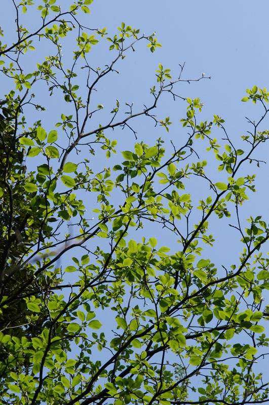 青空を背景にすることで、新緑の枝の立体感が写せる。空の色は方向で濃さが変化。太陽側は薄い青に、太陽の反対側の空は濃い青になる。