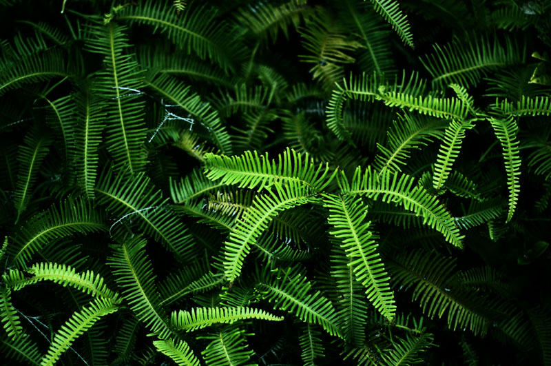 画面全体をシダの緑でうめるために生い茂るシダの一部を切り取った。光が当たっているところと明暗の差で奥行きが強調される。