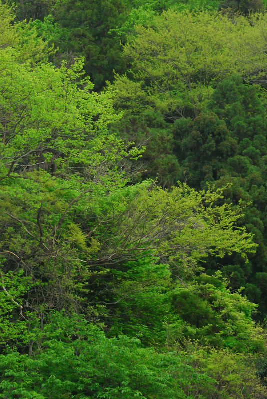 新緑のきれいな部分を選び、望遠でアップにして切り取り、画面を新緑の濃淡で構成する。