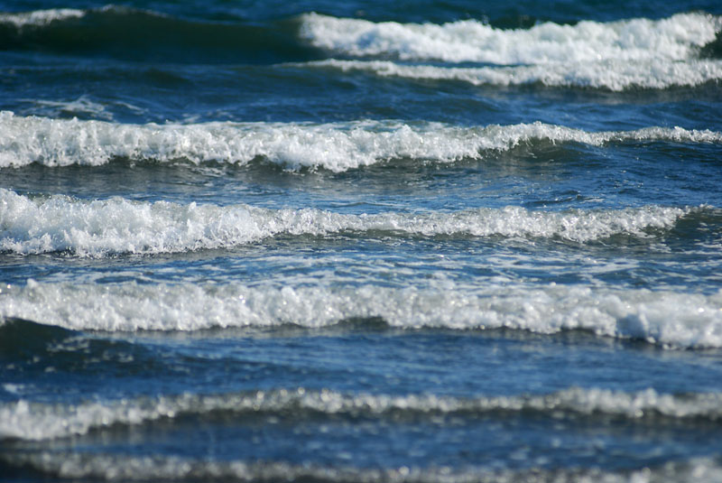 シャッターチャンスは一期一会。出会ったときに逃さないよう常に心構えしておこう。ここでは、望遠レンズで寄せてくるさざ波の重なりを切り取り、横のラインが並んだパターン構図でまとめた。