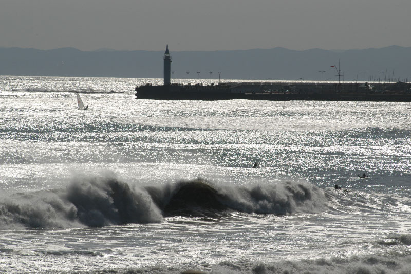 逆光になる方向に移動して、きらめく海面を撮影。太陽が高い時間帯ではこのようなきらめきにならない。夏よりも冬の方が逆光のきらめきが見られる時間が長い。作例では、かなり遠くにある灯台もフレーミングし、ズームを望遠にして撮った。逆光でシルエットにして、きらめく海面の中のアクセントにした。
