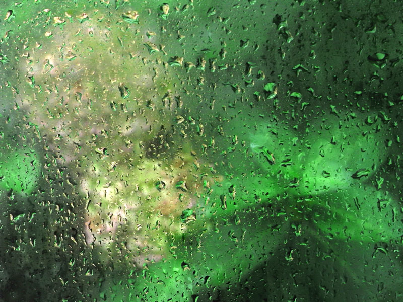 車の運転席から運転席側のウインドウにピントを合わせて撮影した。ウインドウから白い柵までの距離はおよそ1メートル。かなりの激しい雨でウインドウにたくさん水滴ができたので、その水滴を撮った。