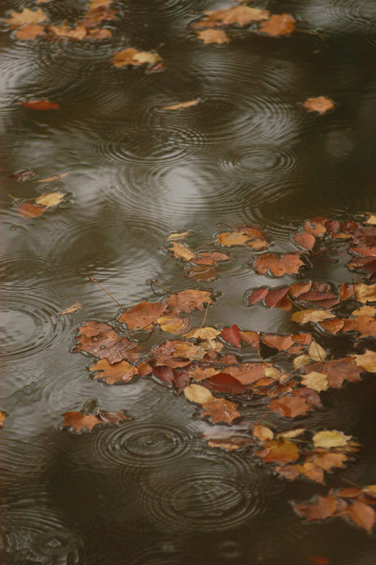 波紋や水面のパターンは、明るさの違う映り込みのある水面の、明るさの境界部分で撮ると形が際立って効果的。ここでは、池に落ちる雨が作る波紋の形を表現するために、木の間から空が映り込んでいるポイントを撮った。