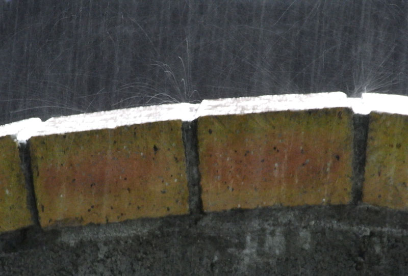 激しい雨だったので、レンガの上にたたきつけるように雨粒が落ちては水滴が跳ね回っている。この水滴の軌跡は白く写るため暗い背景を選び、感度を低くして雨粒の動きを撮った。