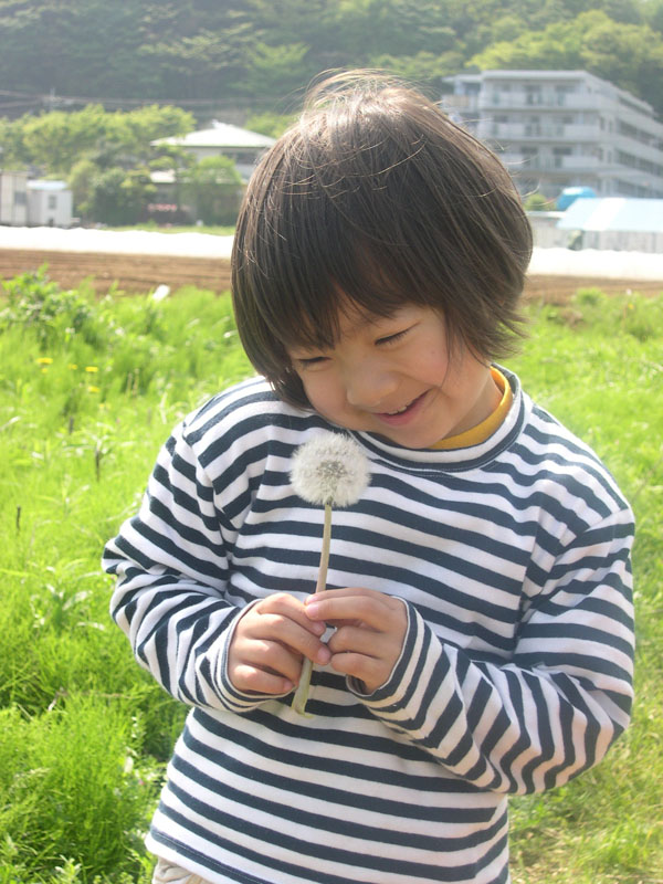 子どもの写真はシャッターチャンスが最重要。「かわいい」と思った瞬間にすかさずシャッターを切ることが大事。このときは、「あら、お花持ってかわいい~」と声をかけ、反応した瞬間撮影した。