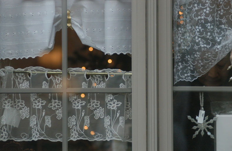 かわいいカーテンやオーナメントが、きれいにディスプレイされたお店の窓を撮影。直射日光が入らない歩行者専用道路沿いの窓を曇りの日に撮影したので、店内のライトが生きるように露出を調整した。