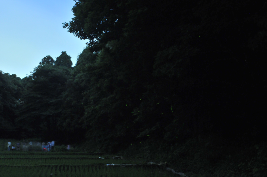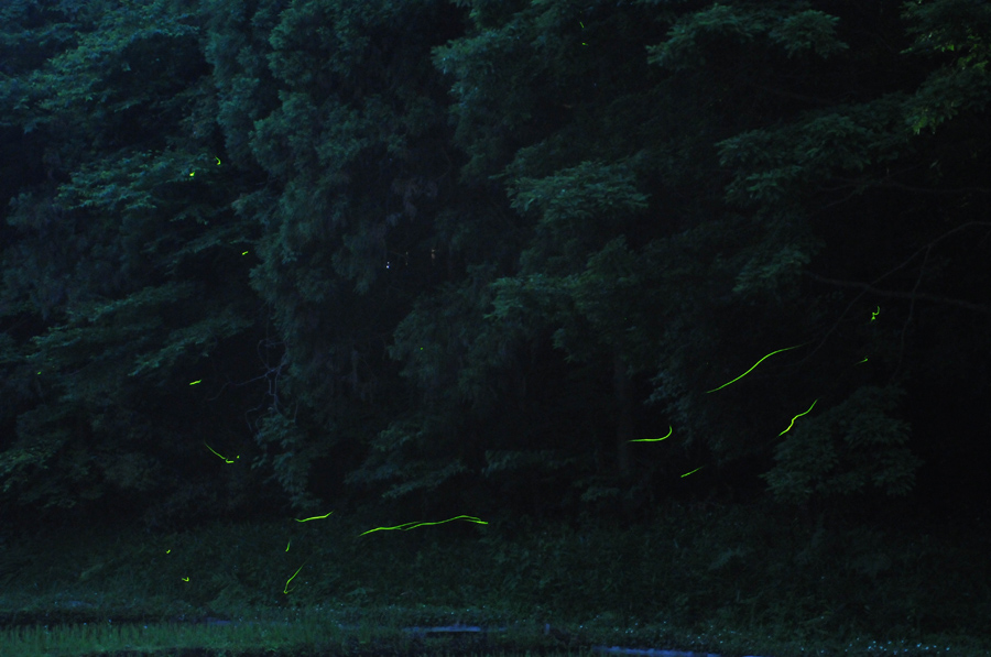 保存会の人に聞いたところ、蛍は風のない湿気の多い日によく飛ぶそうです。また、蛍が光るのは繁殖のための行動なので、カップルが成立すると光らなくなるそうですからその前でないと蛍の光は撮れないことになります。私は日没ちょっと前から入って光り始めるのを待って撮り始めましたが21:00くらいにはだいぶ光は減ってしまい、一番光っていた時間帯の半分くらいになってしまっていました。たぶん一番光っていたのは19:30前後であったと思います。短い時間しか撮れない写真の場合はちょっと早目に入っておくのがおすすめです。