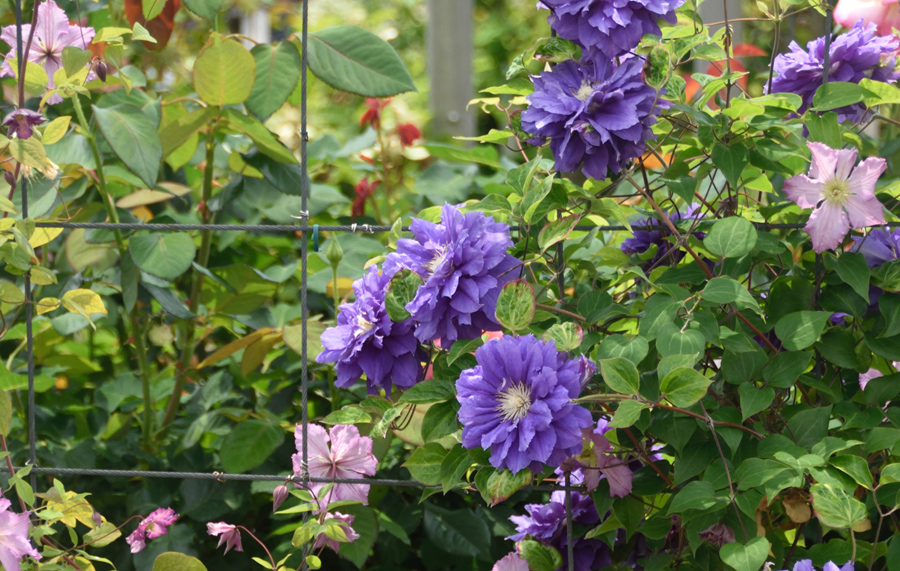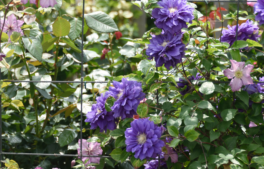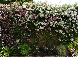 ガーデニングをする人は咲いたときのデザインを工夫して花を植えるので咲いたときの全体の写真を撮ってもらいたいようです。全部がきれいに咲いているタイミングは本当に短いので私がきれいなところを選んで切り取って撮っていると「全体も撮っておいて」とよく言われます。作例1はウッドフェンスにはわせたバラです。(実家ではありませんが)このような写真を撮るときはまずは水平が傾かないように注意しましょう。直線的な物が入っている場合画面が傾いていると思いのほか、かっこ悪い写りになってしまいます。また、日の当たり方も日向と日陰がまだらになっていると、きれいに撮れません。できれば光の状態が均一に(日陰なら全部日陰、日向なら全体に日が当たっている)なる時間帯を狙いましょう。