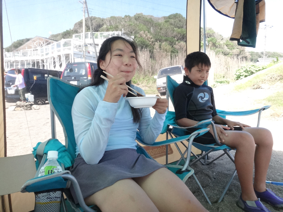 バーベキューをするときは屋外で食べるのでタープなどで日陰を作って食べるスペースを作ることがほとんどです。作例2は海で撮った写真ですが、山キャンプと違って海岸には木陰がないためタープの下にイスやテーブルを置いて食事するスペースを作りました。このような状況では人物は日陰でも背景が日向になってしまいます。つまり人物が暗く、背景が明るいわけですから露出補正なしで撮ると背景はちょうどよくても人物が暗く写ってしまうことがあります。作例2はタープの下で撮ったので+1補正して人物が適切な明るさになるように露出補正して撮っています。その時の状況やフレーミングにもよりますが人物が日陰になっているときは背景との明るさの差に注意して撮りましょう。
