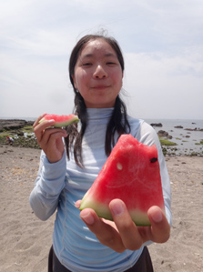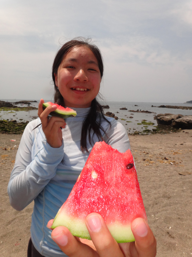 人物の顔に日が当たっていない状況では顔が暗く写ることがあり、特に帽子をかぶっていると顔が暗くなるので日中シンクロ(日中の明るいところでストロボを使うこと)を使ったほうが良い場合があります。実際以前日中シンクロをおすすめしたことがありますが手前にものがある場合はノーストロボのほうがナチュラルな感じになります。作例3はストロボを使って撮った写真ですが、手に持ったすいかをカメラに向かって差し出しているのでこのスイカにストロボの光が当たっているのが写真上でかなり目立ちます。この状態だと写真にしてみた時にスイカに直接あたったストロボの光が不自然な感じになってしまいます。作例4はノーストロボで撮っています。光の状態としては作例4のほうがナチュラルな感じになっているのがわかります。人物の手前に何か物を入れてフレーミングするなら日中シンクロせずにノーストロボで撮ったほうが違和感のない写真に仕上がります。