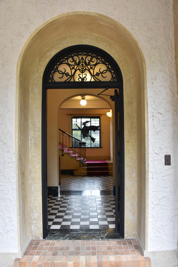 作例4は窓に魔女のペーパークラフトが貼ってあるのをドアの外から撮りました。このように奥行きの深い状況では絞りを開けていると全体にピントが来ません。手前のドアにピントをあわせれば奥の魔女はぼけてしまいますし、魔女の方にピントを合わせれば手前のドアがぼけてしまいます。この作例ではF10まで絞ってドアの上の黒い鉄細工にピントを合わせました。ピントを合わせたところの前後でピントがシャープに見える範囲は手前よりも奥の方が広くなります。全体的にシャープな感じにしたいときは絞りを絞ったうえでちょっと手前目にピントを合わせるとうまくいきます。