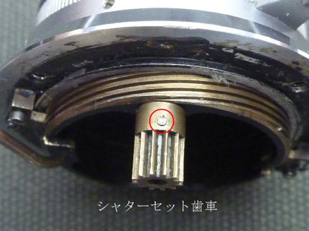 シャッターセット歯車にピンが刺さっています。仮定で抜かなければ分解できずと直感した次第です。