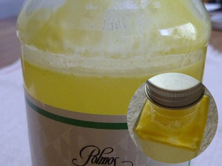 何故か?原因は添加した果汁にありました。果肉(砂じょう)を搾り、漉しても一見綺麗なレモン果汁と思いがちです。ですが微細な果肉の破片が含まれていたのです。最初は綺麗に乳化します。が、時間経過と共にアルコールで脱水され軽くなりました微細果肉が浮いて来るのです。