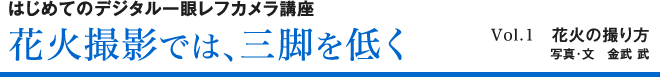 次にマナーですが、花火会場の最前列で三脚を高く立てて撮影している人をよく見かけます。周囲に配慮して、どんな場所でも自分の後ろにお客さん達がいるなら、座って撮影しましょう。座ると三脚を低く設置することになり、安定してブレにくくなります。また、最適な撮影ポイントを見極める目も必要です。場所選びから花火の撮影は始まっています。