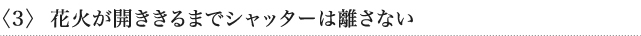 小規模の花火大会でも3000 発以上の打ち上げがあり、オープニングの一発目から撮影する必要はありません。大抵はエンディングに素晴らしい花火がたくさん上がるので、前半はマニュアルでピント合わせをし、後半のクライマックスにはしっかり撮影できる準備をしましょう。