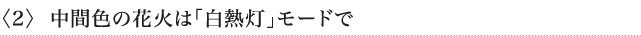 最近は中間色の花火が多いです。ピンクやスカイブルーなどの鮮やかさを表現するには、ホワイトバランス(WB)を「白熱球」にするのがおすすめ。見た目に近い鮮やかさで撮れます。しかし、日本古来のオレンジ色が強い花火は白く写ってしまいます。その場合はオートか「太陽(デイライト)」にしましょう。花火打ち上げプログラム(進行表)を見ながら、次に揚がる花火に合わせWBが変えられたらいいですね。