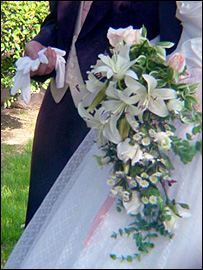 最近流行りのガーデニング・ウエディングの一場面ですね。やはり、晴天の下での結婚式は、キモチがよさそうですね。心なしかブーケの花も、とてもイキイキして見えます。