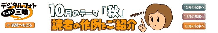 ここでは、2001年10月1日〜11月30日に読者の方々からお送りいただいた作品の中から「フォト美賞」に輝いた作品を、10月のテーマ「秋」の作例として掲載しています。