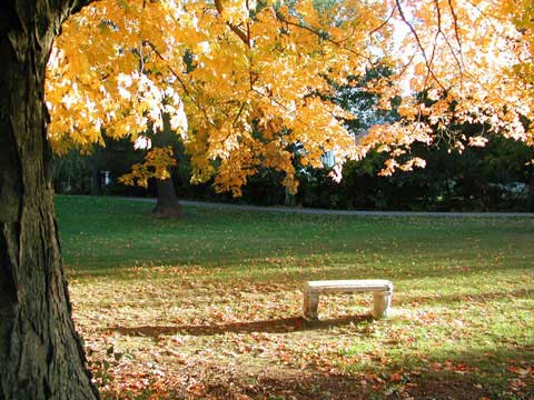 ●コメント 「米国北ニューイングランド地方では、9月の始め頃から紅葉が始まります。今は長くて寒い冬を迎える前の素晴らしい季節です。ここは近所のお宅の庭ですが、このベンチが気に入って、季節ごとに写真を撮ることにしています。夕日を浴びて金色に光る葉が素敵だったので写真を撮りました」