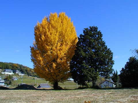 おっと、ホントに隣り合わの樹木でありながら、見事に異なる色ですね。構図もなかなかGOODだと思います。青い空とのコントラストもステキ!