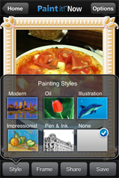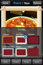 撮りたてホヤホヤの写真やカメラロールからセレクトした写真を、あっという間に絵画風のイラストに変換できちゃうアプリ。まずは好きな写真を選んで、どんなタッチの絵画にするかを決めます。左下の「Style」をタップして、5つのペイントスタイルから選んでみましょう。また、「Frame」をタップすると、好きなフレームを選ぶことができちゃいます。さてさて、このおいしそうなピザの写真が、どんな“アート”に仕上がるのでしょうか? 楽しみ!