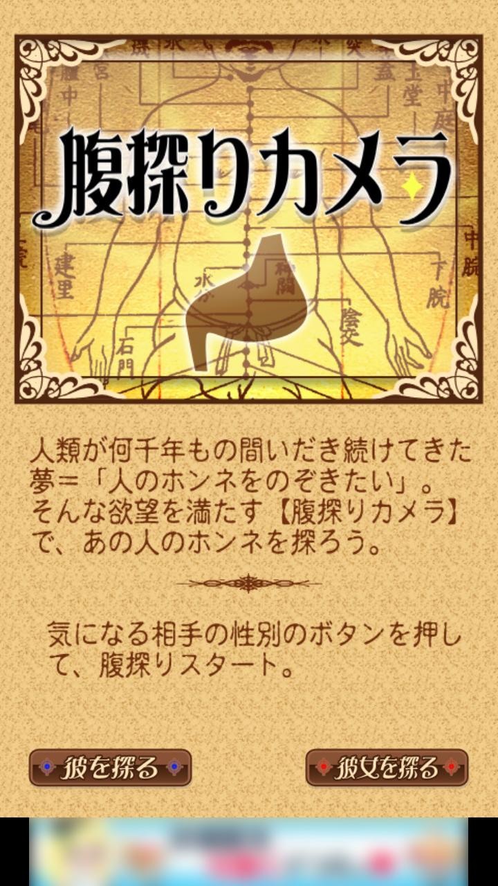 「ホントはどんなことを考えてるんだろう?」「あの人の本音が知りたい……」そんなときにはこの「腹探りカメラ」を使って調べてみましょう!気になる相手をパチリと撮影すると、撮影した写真にくっきりと腹の内(本音)が!飲み会や友達同士集まったときに盛り上がること間違いなしのジョークアプリです。