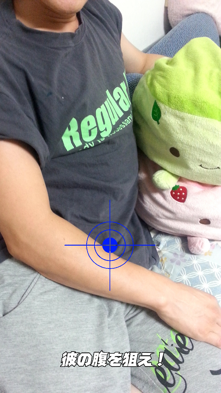 今回はAndroid版で解説しますね。「腹探りカメラ」の使い方はとってもかんたん。アプリを起動すると、[彼を探る][彼女を探る]というメニューが表示されます。被写体が男性なら[彼を探る]、女性なら[彼女を撮る]をタップしてください。まずは[彼を探る]で試してみましょう。[彼を探る]をタップすると、カメラが起動します。[彼の腹を狙え!]というメッセージと共に、青い照準マークが出現しました。。この照準マークを、胃のあたりに合わせるのがコツ。うまく照準を合わせたら、[撮影する]をタップしましょう。さあ、うまく腹を探れたでしょうか?