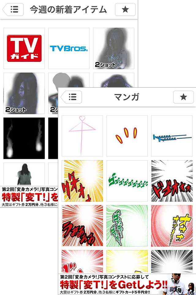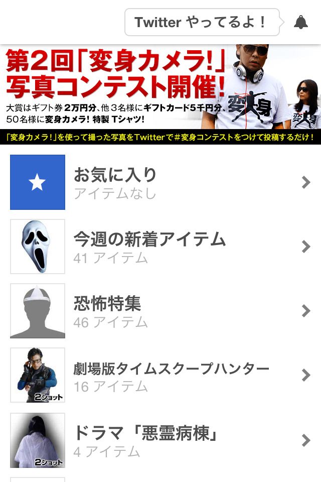 今回はiPhone版で説明しますね。アプリを起動すると、変身アイテムのカテゴリ一覧が表示されます。現在は、[恐怖特集][劇場版タイムスクープハンター] [ドラマ「悪霊病棟」][TOKYO NEWS][映画「忍たま乱太郎」] [UNFAKE][食べ物][魔法・SF][シチュエーション][ファッション][バラエティ][ゲーム][マンガ][テレビテロップ][職業]など、32カテゴリ・1000種類以上の変身アイテムが利用できます。映画などのコラボや、季節に合わせたアイテムもありますね。アイテムは毎週水曜日に追加されるので、[今週の新着アイテム]は要チェックです。