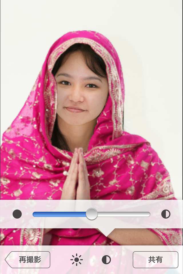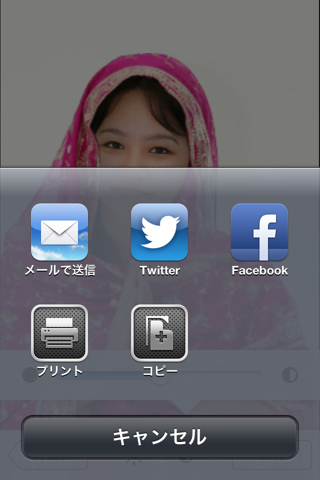 変身アイテムを選択すると、カメラが起動して撮影画面が表示されます。顔認識機能で人の顔を検知して、顔に合わせて自動的にアイテムがフィットしてくれるので、誰でも簡単に撮影できます。アイテムをタッチして、ピンチイン・ピンチアウトで拡大・縮小、二本指でタッチして角度調整ができます。被写体に合わせてアイテムの大きさや位置などを調節してくださいね。被写体とアイテムがいい感じにフィットしたら、画面下部のカメラボタンで撮影!撮影後の画面では、明るさやコントラストの調整もできます。気に入らない場合は、画面左下の[再撮影]をタップして、もう一度撮影しましょう。これで良し!という場合は、画面右下の[保存]をタップして保存してください。保存後に、[保存]ボタンが[共有]ボタンに変わります。[共有]ボタンをタップすると、[メールで送信][Twitter][Facebook][プリント][コピー]のメニューが表示されます。おもしろい写真、かわいい写真ができたら、友達や家族にどんどん共有しちゃいましょう♪