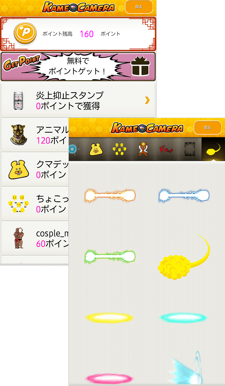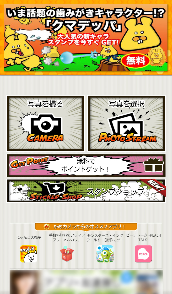 撮影後、[保存]をタップすると、「かめカメラ」の編集画面が表示されます。画面下部中央の[スタンプ]ボタンをタップして、スタンプ画面へ進みましょう。最初は選べるスタンプが少ないのですが、スタンプは追加することができます。画面上部左の[NEW!]というカートのボタンをタップすると、スタンプ一覧画面が表示されます。ポイントと交換できるスタンプ一覧と、ポイント残高を確認できます。ポイントは関連アプリのダウンロードや、「かめカメラ」で加工した写真をFacebookやTwitterで共有することで貯めることができます。あらかじめポイントが付与されているほか、0ポイントでゲットできるスタンプもたくさんありますので安心してくださいね。[炎上防止スタンプ(0ポイント)][アニマルマスク(120ポイント)][クマデッパ(0ポイント)]など、23種類のスタンプ一覧から好きなスタンプを選んでタップすると、スタンプ詳細画面が表示されるので、交換できるポイントを確認し、[スタンプと交換する]をタップしましょう。画面右上の[戻る]をタップして確認してみると、交換したスタンプが追加されています。使いたいスタンプを選んでタップして、写真の上に貼り付けましょう。