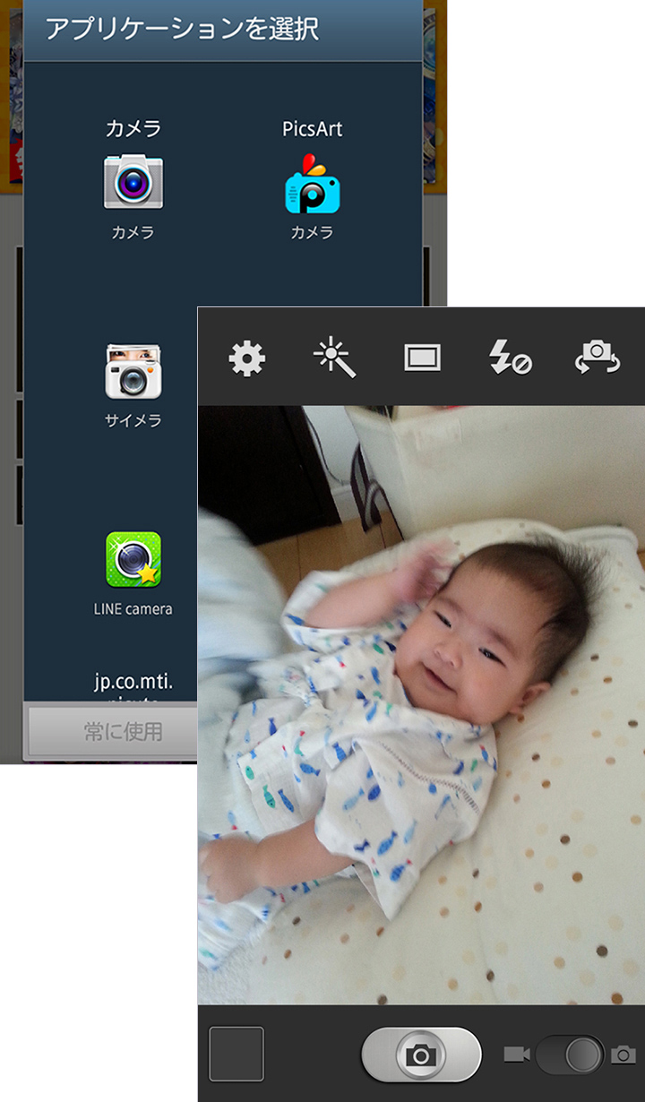 今回はAndroid版で解説しますね。アプリを起動すると、メニュー画面が表示されます。その場で撮影する場合は[写真を撮る]、スマートフォンに保存されている写真を使う場合は[写真を選択]をタップしましょう。[写真を撮る]をタップすると、Android版の場合は、インストールされているカメラアプリを選択する画面が表示されます。躍動感のある写真を撮影する場合は連写モードのあるアプリを、自分撮りの場合はセルフタイマー機能が充実したアプリを、というように用途によってカメラアプリを選択できるのは便利ですね。今回は、スマートフォン本体のカメラで撮影しました。[カメラ]を選択すると、カメラが起動しますので、そのまま撮影してください。スマートフォンに保存されている写真を使う場合は[写真を選択]をタップすると、ギャラリーなどのアプリを選択する画面が表示されますので、アプリを選択後、使用する写真を選んでください。