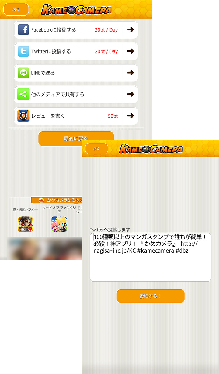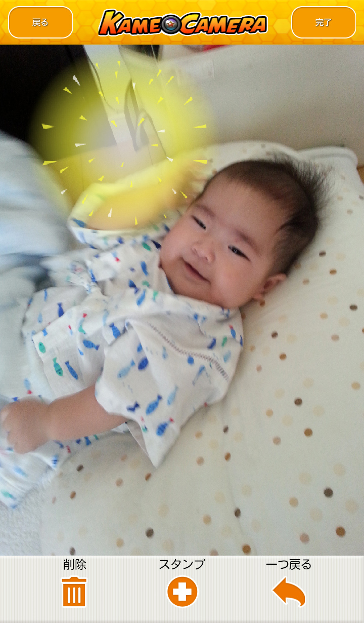 貼り付けたスタンプは、ピンチイン・ピンチアウトで拡大・縮小ができるほか、移動や回転などもかんたんにできます。スタンプはいくつも追加できるので、うまく組み合わせておもしろい写真を作りましょう!加工が終わったら、画面右上の[完了]ボタンをタップすると、スマートフォンに自動的に保存されます。その後、共有画面が表示され、[Facebookに投稿する][Twitterに投稿する][LINEで送る][他のメディアで共有する]が表示されますので、共有したい場合は共有先を選択しましょう。[Facebookに投稿する][Twitterに投稿する]で共有すると、1日ごとに20ポイントが付与されます。おもしろい写真ができたら、共有してお友達やご家族を笑わせちゃいましょう!「かめカメラ」には、マンガやアニメ、ゲームなどでよく見る必殺技風のスタンプがたくさんあるのが特長です。動きのある写真を使うともっとおもしろい写真ができるので、ぜひチャレンジしてみてくださいね。