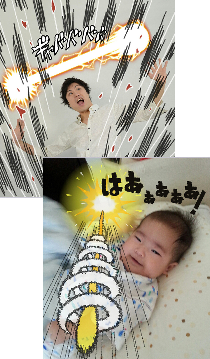 大勢で同時に後方へジャンプしているところを撮影した「マカンコウサッポウ」写真、流行りましたよね。あのような動きのある写真が撮れたら、「かめカメラ」を使って必殺技風スタンプを加えると、もっとリアルな写真を作ることができますよ!