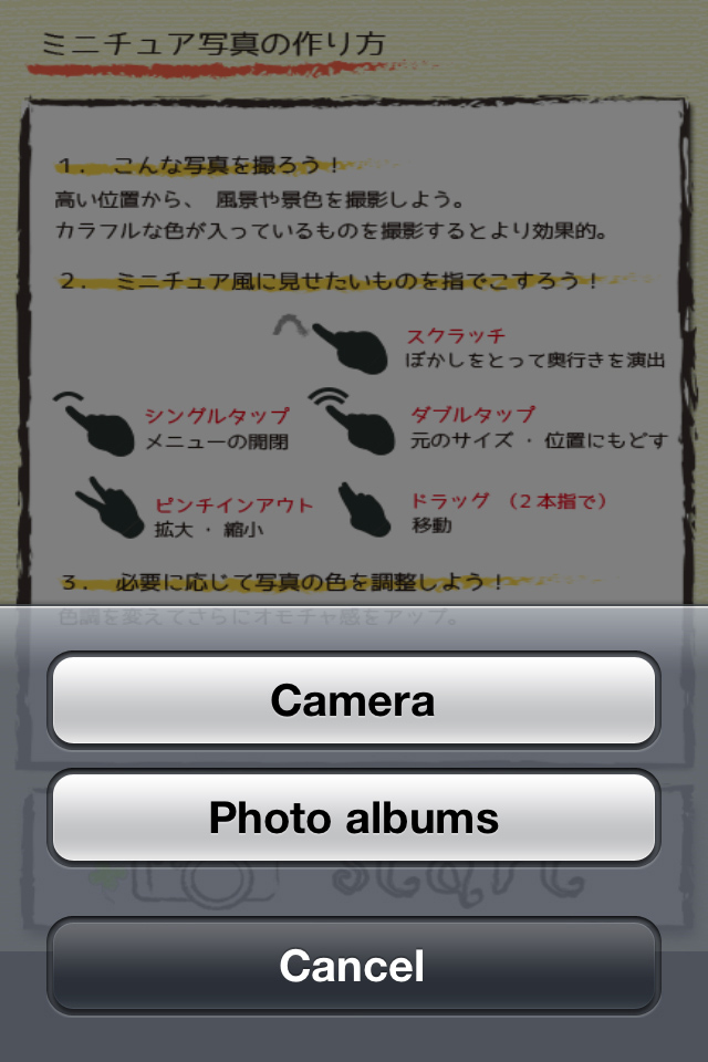 「ミニチュア写真」を起動すると、まず操作方法についての説明が表示されます。このアプリでは写真をセットすると、全体にぼかしが入ります。ぼかしの入った部分を指でこすることでぼかしを取り、写真の奥行きを作っていきます。操作方法は簡単。一本指でこするとぼかしを取ることができ、シングルタップでメニューの開閉、ピンチイン・ピンチアウトで拡大・縮小、ダブルタップで元のサイズ・位置に戻す、二本指でのドラッグで位置の移動ができます。この操作方法を覚えたら、[start]をタップ。[Camera][Photo albums]のメニューが表示されます。その場で撮影する場合は[Camera]を、スマートフォンに保存されている写真を加工する場合は[Photo albums]を選びましょう。このアプリでの加工には、高い位置から風景を撮影した写真やカラフルなものが写っている写真を使うとよりミニチュア感を楽しめます。今回は[Photo albums]から保存されている風景写真を選びました。写真を選択すると、自動的にミニチュア加工された写真が表示されます。