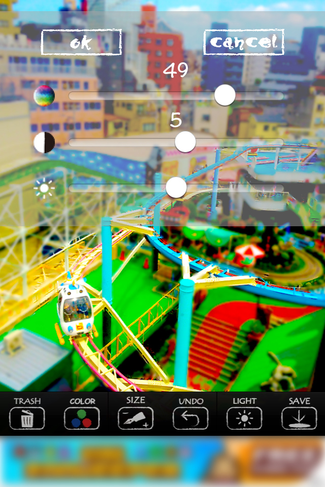 写真が表示されたら、加工スタート!目立たせたい場所を指でこすると、ブラシの丸が画面に現れます。指でブラシを動かしながらこすっていくと、こすった部分のぼかしが外れてくっきりと表示されます。細かい部分を加工したいときは、ピンチインで拡大してください。写真を読み込む際に、自動で色の調整が行われ、ミニチュア風に加工されて表示されますが、自分で色味の調整をすることもできます。シングルタップでメニューを表示させて、画面下部の[COLOR]ボタンをタップ。[鮮やかさ][コントラスト][明るさ]の調整スライダが表示されるので、それぞれ好みの色合いに調整してください。[LIGHT]ボタンをタップすると、写真の周りを暗くしたり、明るさを補正することができます。[SIZE]ボタンでは、こすったときのブラシの大きさを変更できます。丁寧な仕上がりにこだわりたい場合は、拡大した写真を細いブラシで少しずつこすると良いですね。ミスしてしまったときは、[UNDO]をタップすると、一つ前の画面に戻ることができます。最初からやり直すときは、[TRASH]をタップして終了すると、最初の操作説明画面に戻ります。