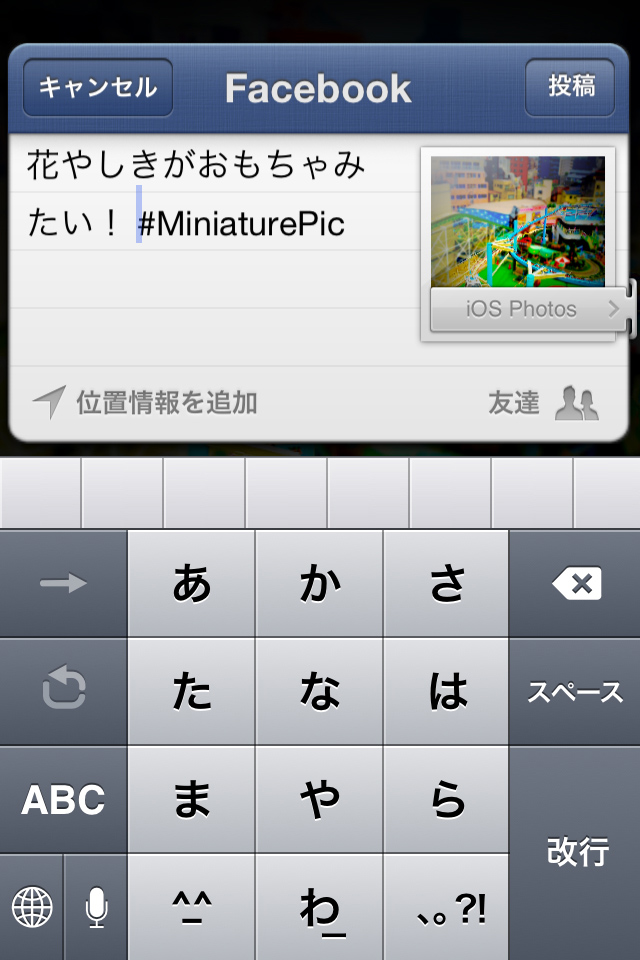 指でこすってぼかしを外すことで、ぼかした部分とくっきりした部分との差が奥行きを演出し、ミニチュア感あふれる写真ができました!元の写真と比べると、おもちゃっぽさが際立ちますね。写真の加工が終わったら、画面下部右端の[SAVE]ボタンをタップしましょう。メニューが表示されていないときは、先ほど同じように画面をシングルタップしてくださいね。[SAVE]ボタンタップで、[Save to Camera Roll][Facebook][Twitter]の共有メニューが表示されます。スマートフォンに保存する場合は[Save to Camera Roll]、SNSで共有する場合は、[Facebook][Twitter]をタップしましょう。[Facebook][Twitter]を選ぶと、コメント入力画面が表示されるので、加工した写真と一緒に投稿したい内容を入力して[投稿]ボタンをタップしてください。このように「ミニチュア写真」は専門的な写真の知識がなくても簡単におもちゃ風・ミニチュア風の写真を作って楽しむことができます。本当にお手軽なので、ぜひ使ってみて下さいね!