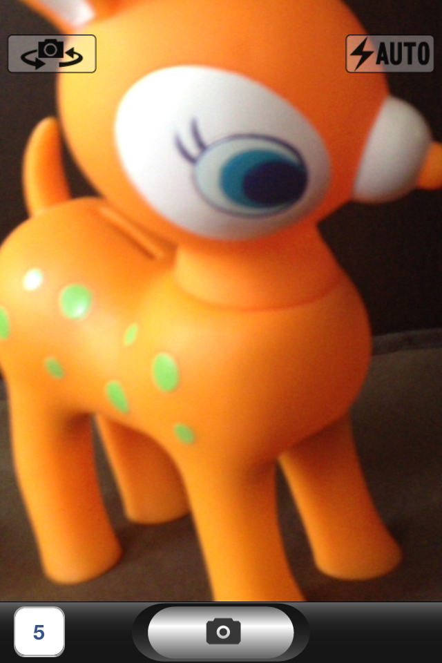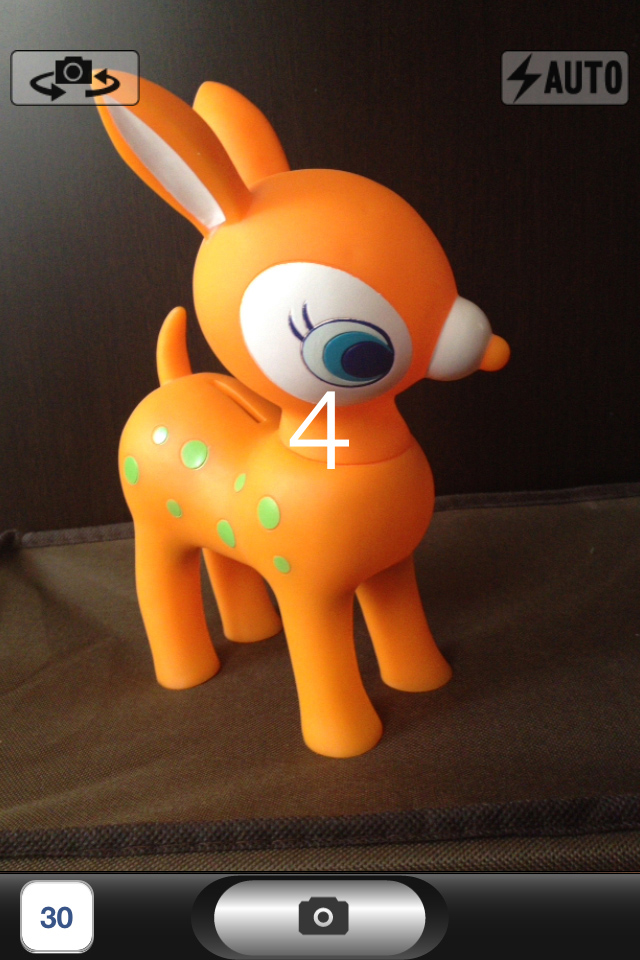 アプリを起動すると、すぐに撮影画面が表示されます。「セルフタイマーカメラ」は無料のアプリですが、撮影画面に広告表示などはありません。シャッターボタンと間違えて広告をタップしてしまうこともなく、撮影に集中できますね。左下にある数字のボタンをタッチすると、セルフタイマーの秒数を変更できます。 タップするごとに、3・5・10・20・30と数字が切り替わり、それぞれの秒数でセルフタイマーを設定することができます。画面右上の[AUTO]はフラッシュの設定です。タップすると、[Auto][ON][OFF]を設定し、フラッシュを制御することができます。外側のカメラで撮影する場合は、撮影画面をタップするとフォーカスの設定ができます(iOS5.0以降の場合は画面にフォーカスの枠は表示されません)。また、ピンチイン・ピンチアウトでズーム撮影が可能です(iOS5.0以上)。