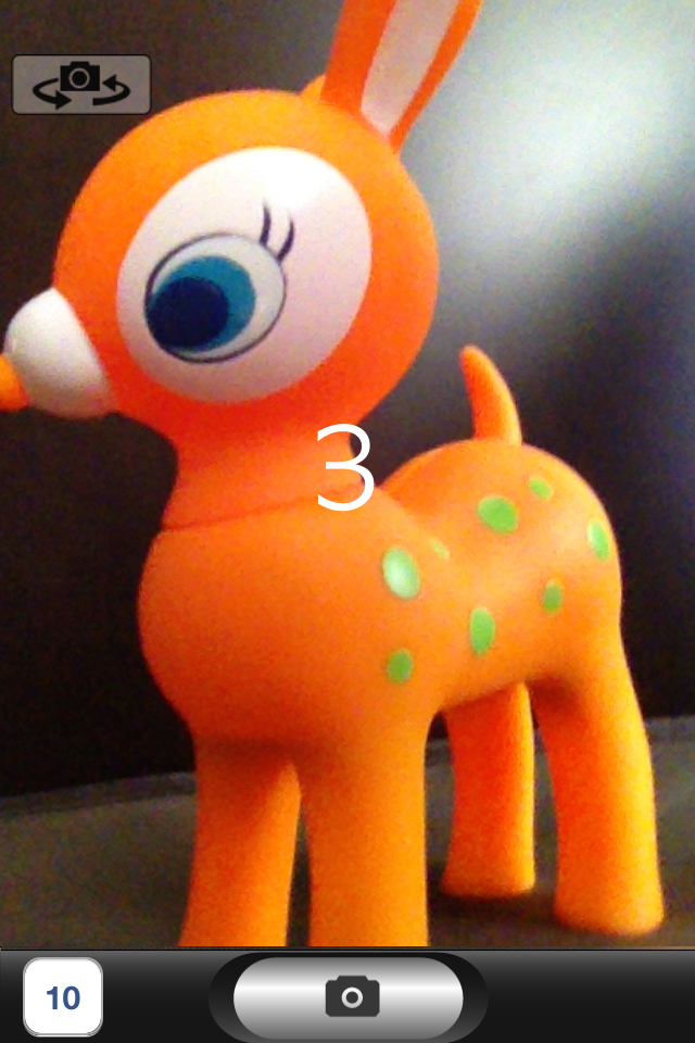 画面左下の数字でセルフタイマーの時間を設定したら、画面中央の撮影ボタンをタップしましょう。設定した秒数からカウントダウンの数字が画面に表示されます。カウントダウンの3秒前からピ、ピ、ピという効果音が鳴るので、準備してくださいね!カウントダウンの効果音は音量ボタンで調整可能ですが、マナーモードまたは音量0の場合は効果音は鳴りません(撮影音は必ず鳴ります)。画面左上に表示されているカメラ切り替えボタンをタップすると、インカメラに切り替えることができます。インカメラでアプリを終了した場合は、次回もインカメラからスタートします。なお、インカメラではズームやフォーカスの設定はできません。