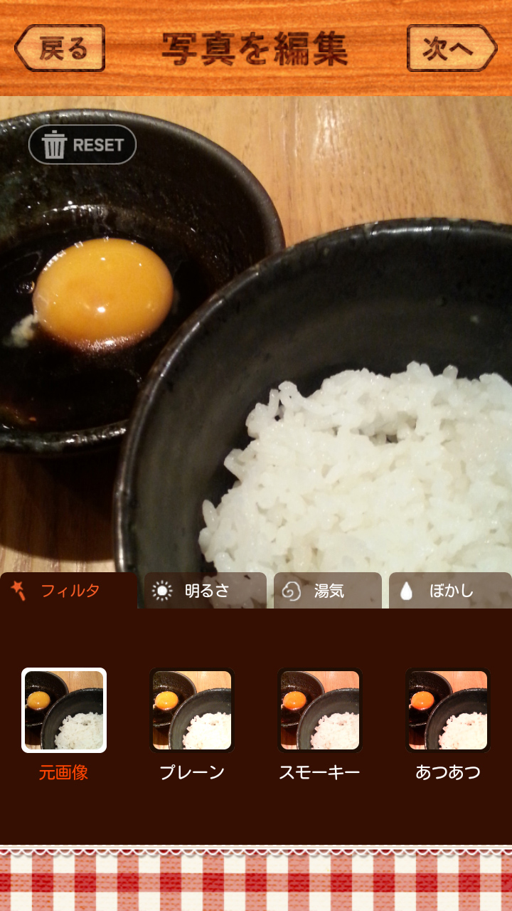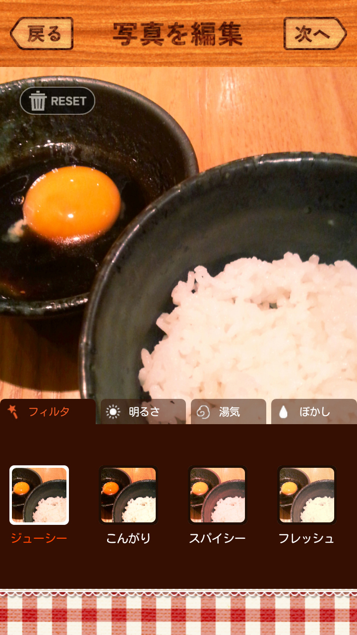 アプリを起動後、画面をタップしてホーム画面へ。その場で撮影する場合は[写真を撮る]をタップ、保存されている画像を加工する場合は、[ギャラリーから選ぶ]をタップしましょう。[写真を撮る]をタップすると、カメラが起動して、正方形の写真を撮影することができます。画面下部のカメラボタンをタップして撮影すると、[トリミング]画面が表示されるので、必要に応じて、写真の移動や拡大縮小を行ってください。画面右上の[次へ]をタップすると、[写真を編集]の画面へ進みます。加工メニューは、[フィルタ][明るさ][湯気][ぼかし]の4つ。まずは[フィルタ]を使ってみましょう。フィルタの種類は、[プレーン][スモーキー][あつあつ][リッチ][ジューシー][こんがり][スパイシー][フレッシュ][スイート][クール][ナチュラル][ベジー][フローラル][テリ][エスニック][ミルキー]の16種類。画面下部にサムネイルが表示されるので、どのフィルタにするとどんな雰囲気になるか分かりやすいですね!