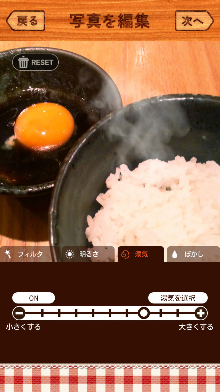 撮影した料理が温かい料理であれば、もっと美味しそうに加工する方法があります![湯気]のタブをタップすると、湯気のエフェクトを5種類から選択できます。好きな形のものを選んだら、湯気を出したい位置で画面をタップすると、選んだ湯気が合成されます。湯気は位置も大きさも自由に変更できます。湯気のサイズは、ピンチイン・ピンチアウトまたはスライダを使って変更してください。また、一度設置した湯気を消したい場合は、スライダの左上にある[ON]をタップして[OFF]にしましょう。もう一度別の湯気を選び直したいときは、スライダの右上にある[湯気を選択]をタップしてくださいね。今回はごはんの上に湯気を合成してみたのですが、湯気があると炊きたてのごはんに見えて、とっても美味しそうに仕上がりました。[明るさ]タブをタップして、明るさを調整したり、[ぼかし]タブでは指定した部分以外をぼかすこともできます。