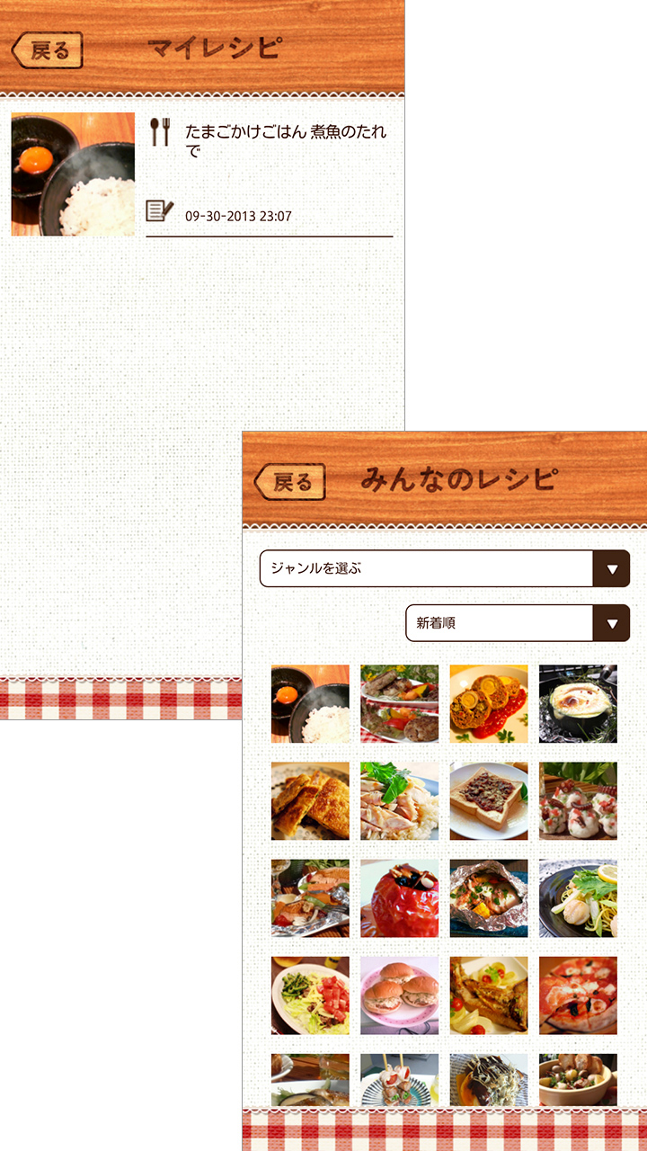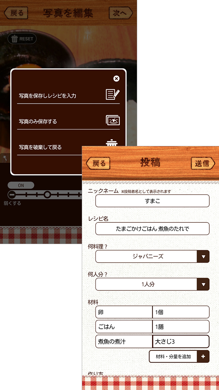 写真の編集が終わったら、画面右上の[次へ]をタップしましょう。[写真を保存してレシピを入力][写真のみ保存する][写真を破棄して戻る]というメニューが表示されます。[写真を保存してレシピを入力]をタップすると、レシピの記入ができる[投稿]画面に進みます。[ニックネーム][レシピ名][何料理?(ジャンル選択)][何人分?][材料][作り方]を任意で入力できます。レシピを途中で保存したい場合は、画面下部の[編集中のレシピを下書き保存する]をタップしてください。入力したレシピを保存する場合は、画面右上の[送信]ボタンをタップすると、Facebookに投稿するチェックボックス、「青空めしカメラレシピフォトコン(応募期間は2013/10/31まで)」に投稿するチェックボックス、[レシピを投稿]ボタンが表示されます。Facebookまたはフォトコンに投稿したい場合は、チェックを入れてから、どちらにも投稿しない場合はチェックを入れずに[レシピを投稿]ボタンをタップしましょう。投稿したレシピは[料理アーカイブ]に保存され、他のユーザーから見える状態になります。他のユーザーに見られたくない写真やレシピには注意してくださいね。ホーム画面の[料理アーカイブを見る]をタップすると、[マイレシピ]で自分の作った料理写真とレシピを確認したり、[みんなのレシピ]で他の投稿者のレシピをチェックできます。カメラアプリとしてはもちろん、レシピアプリとしても楽しめますよ!