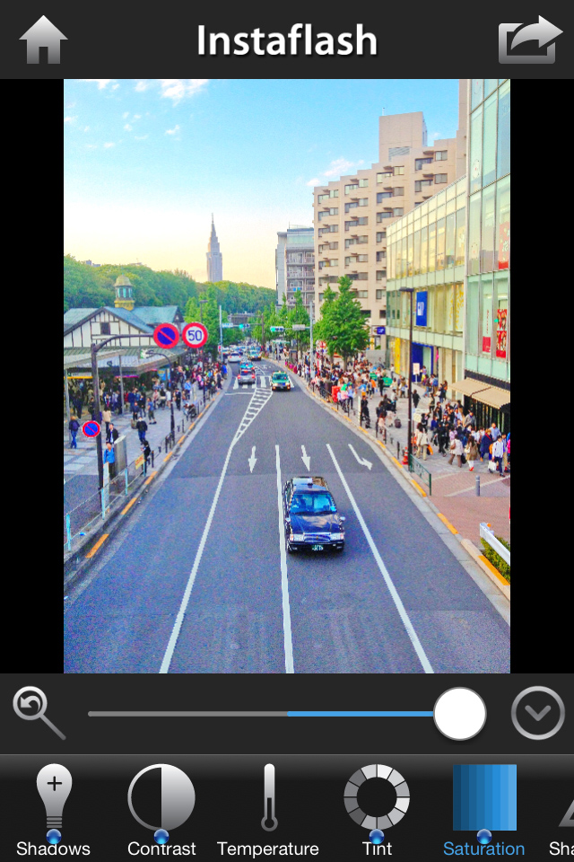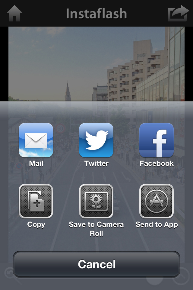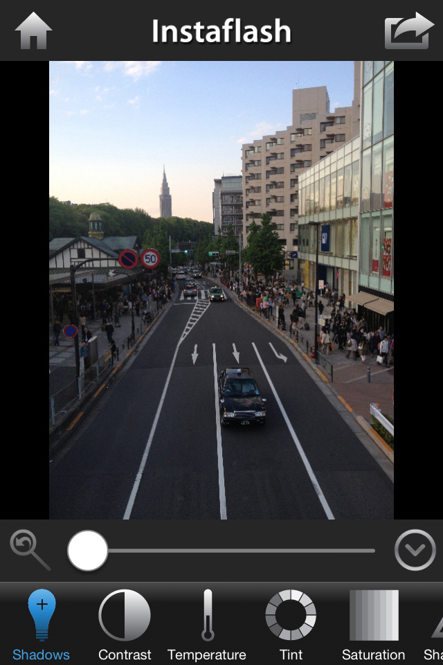 [Shadows]の他にも加工メニューがたくさんあります。[Contrast]ではコントラストの強弱、[Temperature]では写真に温度感を持たせる色合い、[Tint]では色相、[Saturation]ではモノクロから鮮やかな色まで彩度を、それぞれスライダを動かすことで調整することができます。[Sharpness]ではスライダを右にすると被写体のエッジが浮き出るような写真になります。[Geometry]では、1:1、2:3、3:4、縦の黄金比、3:2、4:3、16:9、横の黄金比で切り抜くことができます。[More]をタップすると、アドオン「プロパック」(¥170)を購入した場合に使えるようになる機能をプレビューすることができます。一通りの加工が終わったら、画面右上のアクションボタンをタップしましょう。[Mail][Twitter][Facebook][Copy][Save to Camera Roll][Send to App]という保存・共有メニューが表示されます。