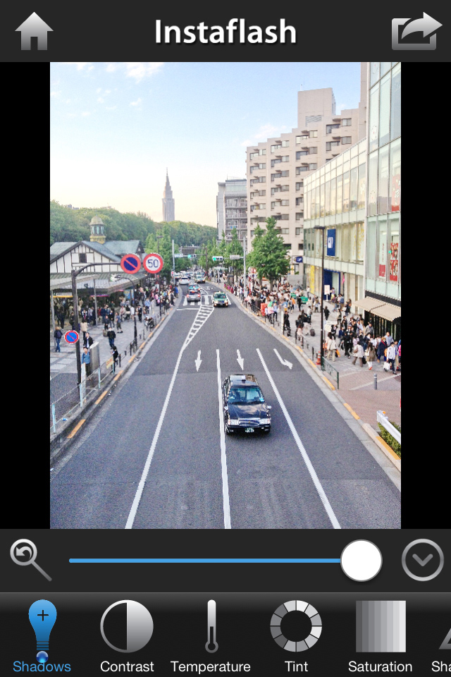 アプリを起動すると、[写真マーク]と[カメラマーク]が表示されます。[写真マーク]をタップすると、保存されている写真を選んで加工でき、[カメラマーク]をタップすると、その場で撮影することができます。今回は、保存されている暗い写真を補正してみましょう。[写真マーク]をタップして、補正したい写真を選びます。画面に写真が表示されたら、画面下部の[Shadows]が青く選択状態になっていることを確認し、スライダを右に動かしてみましょう。すると、写真が少しずつ明るくなってきます!ACD Systems の「LCE (Lighting and Contrast Enhancement)」技術を利用しているため、明るい場所で撮影したような、自然な明るさに仕上がります。ピンチイン・ピンチアウトで写真の拡大・縮小ができ、画面をタップするとフルスクリーンで表示することができます。左側の矢印マークのアイコンを長押しすると、押している間だけ元の写真が表示されます。いつでも元の写真との違いをチェックできますね。