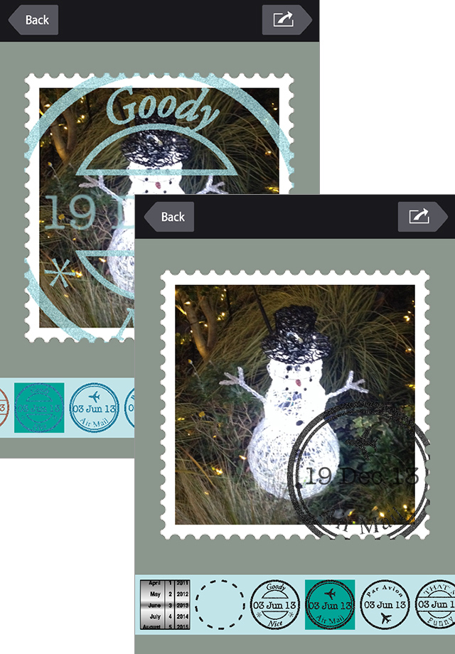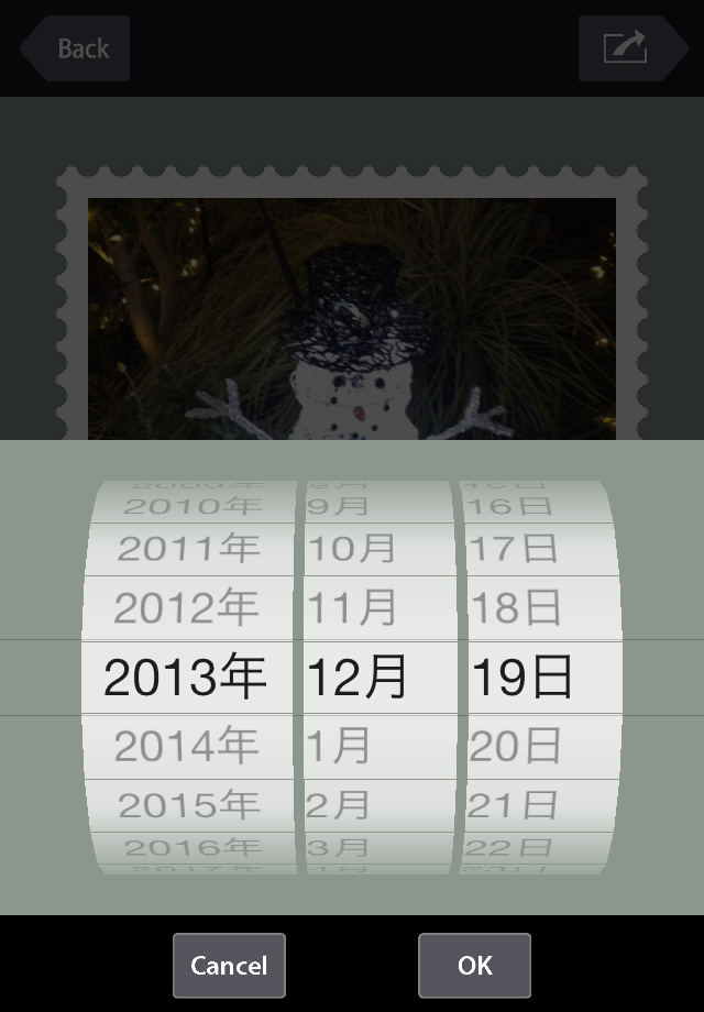 次に、消印スタンプを押します!まず、消印スタンプの中に表示する日付を選びましょう。好きな年月日を自由に設定することができます。画面左の日付ロールをタップして、好きな年月日を選択したら、[OK]をタップ。選択しない場合は、当日の日付になります。次に、消印スタンプの色と種類を選びましょう。消印スタンプは、チャコール・ベージュピンク・ペールブルーの3色7パターンで、全21種類。消印スタンプを押さない選択もできます。画面下の消印スタンプをスクロールして、選んだ写真に合いそうな消印スタンプを選んでタップすると、画面に消印スタンプが押されます。最初は右下に押されますが、好きな位置に移動できます。また、大きさも角度も自由に変えられます。ピンチイン・ピンチアウトで拡大・縮小、二本指で角度の調整です。