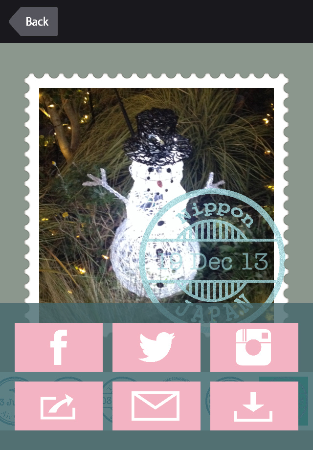 単一の色合いが多い写真だと、どんな消印スタンプでもマッチしますが、いろいろなものがたくさん写っていると、位置や大きさによっては消印スタンプの文字が見えなくなることもあります。写真選び、消印スタンプの位置や大きさ、角度を工夫してみましょう。同じ写真でも、消印スタンプの色や種類を変えると、雰囲気が変わるので、いろいろ試してくださいね。消印スタンプの調整が終わったら、画面右上のアクションボタンをタップしましょう。共有・保存メニューが表示されます。Facebook・Twitter・Instagram・その他アプリへ共有・メールで送る、そして画面右下のボタンでスマートフォンに保存することができます。好きな方法で家族やお友達に共有しましょう!保存した画像をSNSのプロフィール画像に設定することもできますよ。このアプリの特長は、画面に文字の表示がほとんどなく、直感的にボタンやアイコンをタップするだけで、サクサク進めること。素人にはちょっと難しい写真用語がいくつも出てくるカメラアプリが多い中、このシンプル操作はかなり魅力的です!