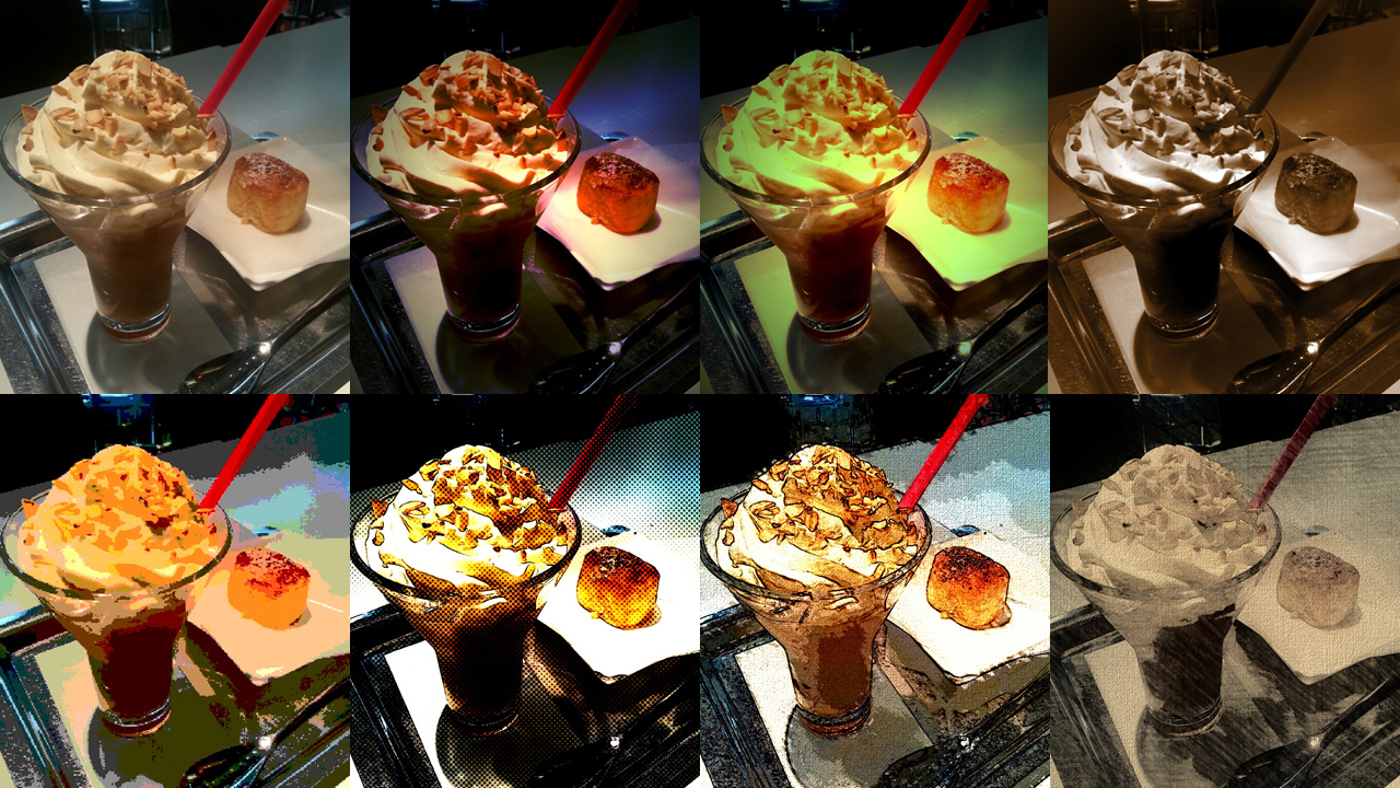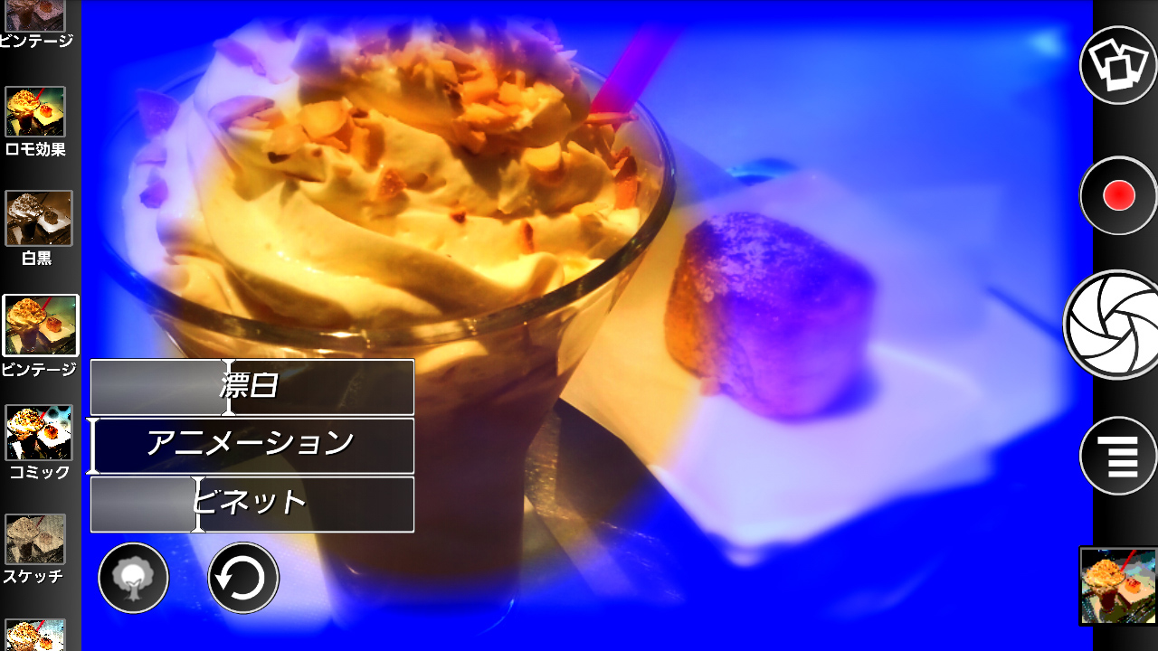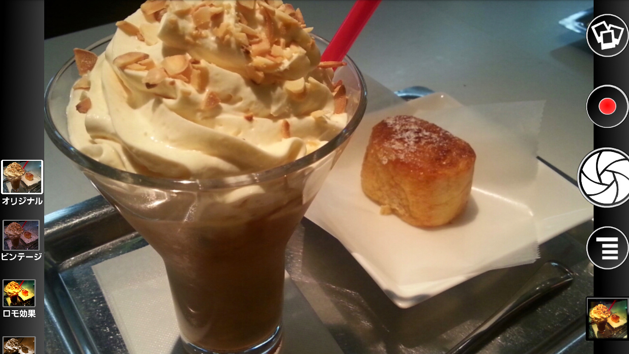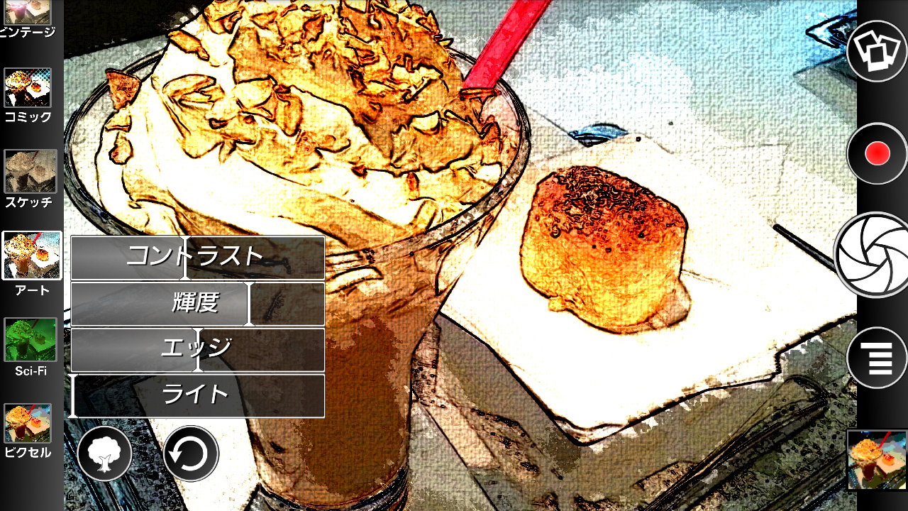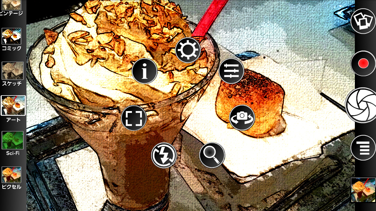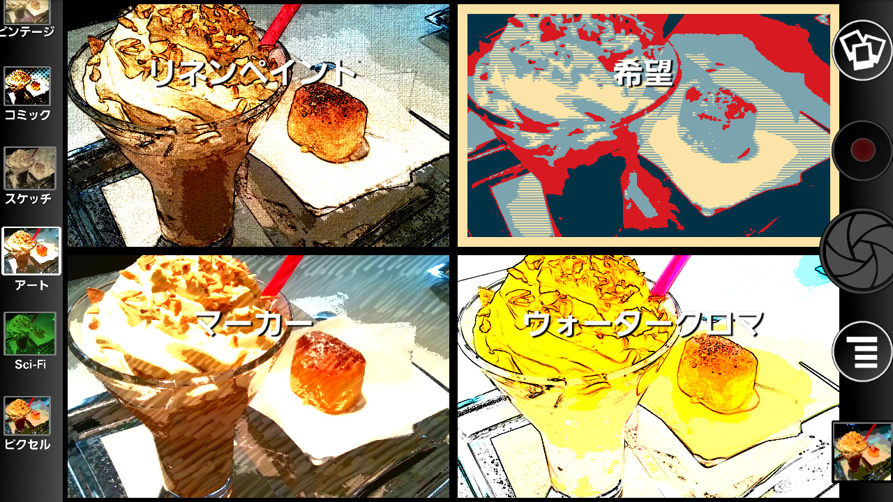 アプリを起動すると、すぐに撮影画面が表示されます。このアプリは縦画面でも横画面でも使えますが、今回は横画面で撮影してみますね。画面左側にフィルタ一覧が表示されます。撮影効果なしの[オリジナル]の他、[ビンテージ(1920・1940・1950・1960・1970・1980)][ロモ効果(Lucy・Tommy・Matty・Lomy・Kenny・Marty・Starry・Daddy)][白黒(ハイコントラスト・ローコントラスト・パンチ・セピア)][ビンテージ(悲しい本・パイ・ヒーロー・Bimbomix・Fasson・Richmond)][コミック(コミックブラスト・ダークノベル・ハーフコミック・ファンキードット)][スケッチ(鉛筆・ペン・紙)][アート(リネンペイント・マーカー・希望・ウォータークロマ)][Sci-Fi(グリーンレイン・レトログロー)][ピクセル(キャラクター・モノクローム・CGA・EGA・VGA)]の9カテゴリ42種類ものフィルタが用意されています。カテゴリをタップすると、現在カメラに写っている被写体に各フィルタが適用されている状態で、サムネイルが表示されます。[アート]のフィルタをタップしてみると、カメラに写っていたドリンクとお菓子に、リネンペイント・マーカー・希望・ウォータークロマのフィルタ効果が適用されました。