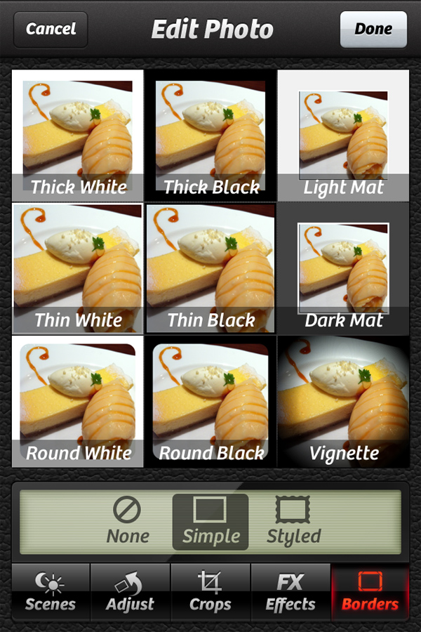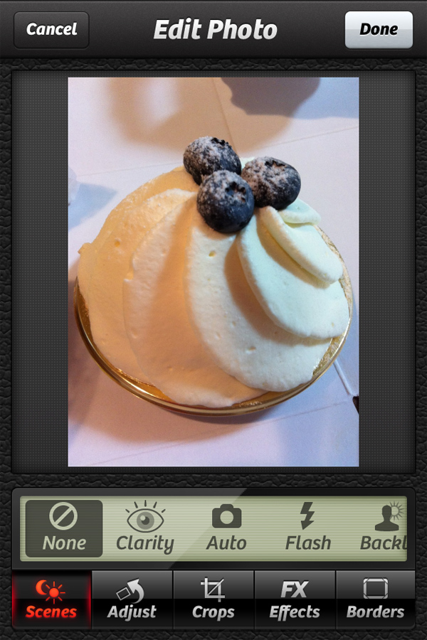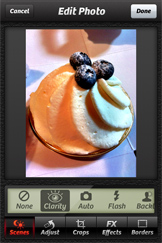 ピントと露出を別々に合わせて、プロも思わず唸ってしまいそうな写真が簡単に撮影できるアプリ。でもこのアプリ、スゴいのは撮影機能だけじゃないんです。エフェクトの種類がとっても豊富で、撮った写真をいろいろ加工できちゃうんです。撮影した写真をタップし、“edit”をタップ。試しに“Clarity(目のマーク)”のエフェクトをかけてみました。どうですか? ケーキのクリーム部分の輪郭がキレイに出て、雰囲気のある写真になりましたよね?